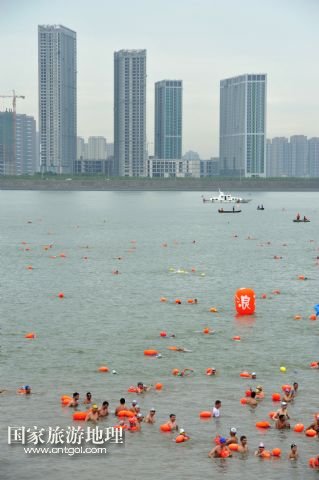 國家旅游地理 浙江杭州8月3日訊 8月3日,游泳愛好者躍入錢塘江暢游。當日,2013年“橫渡錢塘江 暢游母親河”活動在杭州舉行。據悉,本次活動將開展泳程1200米的群眾性橫渡錢塘江以及泳程1500米左右的公開水域游泳比賽,參加活動人數超過1700人。新華社發(fā)(李忠 攝)