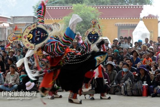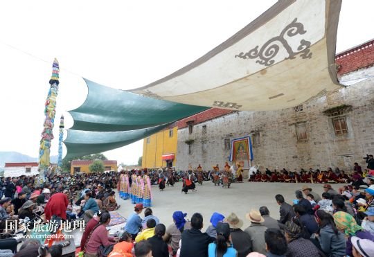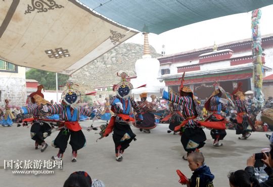8月6日,在西藏堆龍德慶縣乃瓊鎮(zhèn)甲熱村舉行的雪頓節(jié)曬佛慶典上,甲熱村覺(jué)木隆藏戲團(tuán)的演員們?nèi)雸?chǎng)表演。