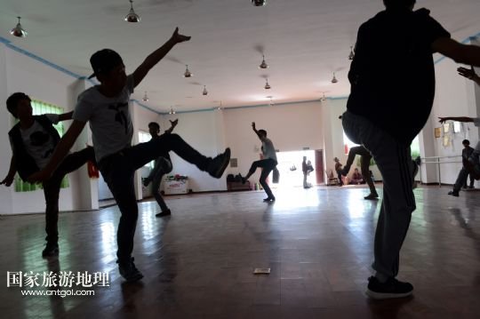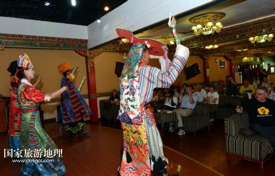 8月4日,在西藏拉薩,覺(jué)木隆藏戲團(tuán)的演員們?yōu)橐患屹e館的客人演出。