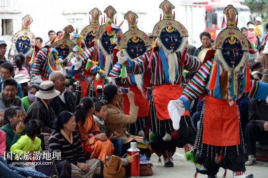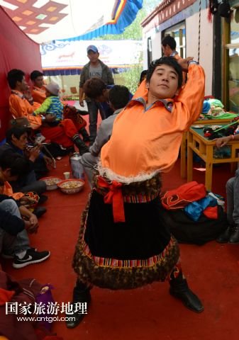 8月6日,在西藏堆龍德慶縣乃瓊鎮(zhèn)甲熱村,覺(jué)木隆藏戲團(tuán)的演員們?cè)诖謇锏难╊D節(jié)慶典上表演。