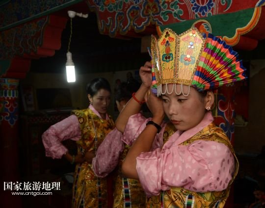 8月3日,在西藏堆龍德慶縣乃瓊鎮(zhèn),覺(jué)木隆藏戲團(tuán)演員次珍在望果節(jié)演出前練習(xí)。