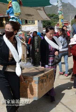 國(guó)家旅游地理 西藏拉薩8月9日訊 8月6日,在西藏堆龍德慶縣乃瓊鎮(zhèn)甲熱村,覺(jué)木隆藏戲團(tuán)團(tuán)長(zhǎng)瓊達(dá)(前右)在演出后和團(tuán)員一起搬運(yùn)道具。藏戲是藏族人民喜聞樂(lè)見(jiàn)的藝術(shù)形式,而發(fā)源于甲熱村(舊稱(chēng)覺(jué)木隆)的覺(jué)木隆藏戲在藏戲各流派中流傳最廣。