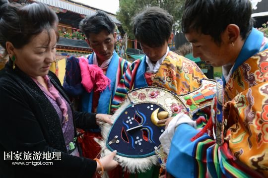 8月3日,在西藏堆龍德慶縣乃瓊鎮(zhèn),覺(jué)木隆藏戲團(tuán)團(tuán)長(zhǎng)瓊達(dá)(中)和演員們準(zhǔn)備參加鄰近幾個(gè)村的望果節(jié)演出。