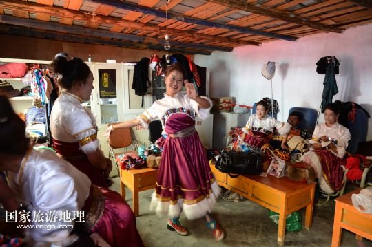 如今瓊達(dá)的藏戲團(tuán)每年演出200多場(chǎng)。一年一度的羅布林卡雪頓節(jié)藏戲匯演自然是重中之重,藏歷年和望果節(jié)也是劇團(tuán)最繁忙的時(shí)候。為了增加收入,劇團(tuán)還承接賓館酒樓和朗瑪廳等場(chǎng)所的小型演出任務(wù),表演內(nèi)容有藏戲,也有民族舞蹈。劇團(tuán)每年總收入二十多萬(wàn)。演員參加排練一天工資50元,參加演出一天工資100元。在淡季,他們還要回到農(nóng)田干活。雖然在劇團(tuán)的收入不高,比起幾年前已經(jīng)有了很大進(jìn)步。