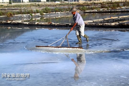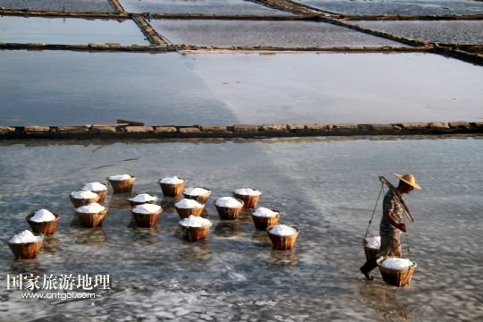 國家旅游地理 浙江臺州8月10日訊 8月10日,在浙江溫嶺市石塘鎮(zhèn)蒼岙鹽場,一名鹽工頂著太陽在鹽田里把曬好的鹽收集起來挑到鹽堆去。連日來,浙江省溫嶺市石塘鎮(zhèn)蒼岙鹽場的鹽工利用晴熱天氣忙著曬鹽。對于浙江的曬鹽人來說,夏季陽光最猛烈的7月、8月、9月這三個月是他們勞作的黃金季節(jié)。天氣越炎熱,光照越猛烈,曬鹽效果就越好。炎熱的夏天艷陽高照,而曬鹽人卻要頂著高溫出門勞作。 /新華社發(fā)(梁敏慧 攝)