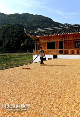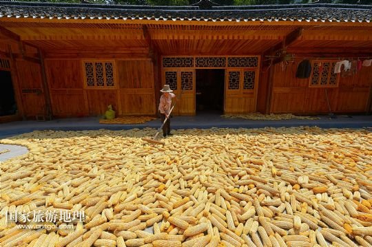 國(guó)家旅游地理 湖北恩施8月22日訊 8月22日,湖北省宣恩縣水田壩村二組農(nóng)民侯慶云在吊腳樓前晾曬玉米。初秋時(shí)節(jié),湖北省恩施土家族苗族自治州宣恩縣農(nóng)民搶抓時(shí)節(jié),對(duì)玉米等農(nóng)作物進(jìn)行收獲晾曬,山鄉(xiāng)家家戶(hù)戶(hù)忙“曬秋”,到處是一派豐收景象。 /新華社發(fā)(宋文 攝)