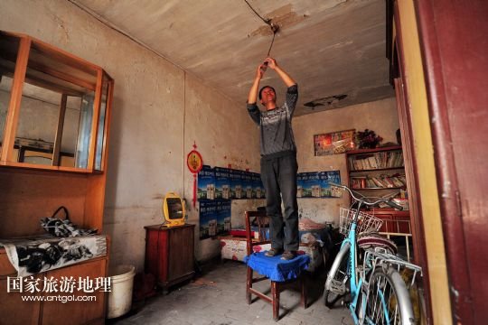 在寧夏回族自治區(qū)石嘴山市大武口區(qū)人民街道工人街社區(qū)的原洗煤廠老舊小區(qū)內(nèi),46歲的馬連生在屋里安裝新的燈泡。他在這里已經(jīng)居住了14年(9月3日攝)。