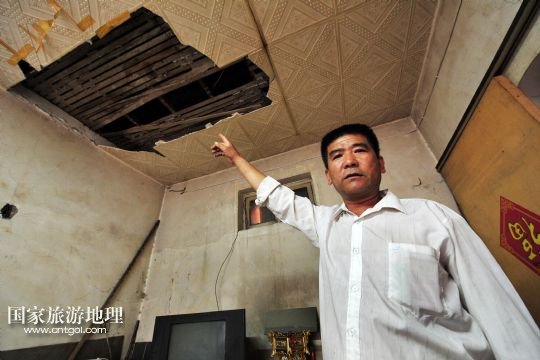 在寧夏回族自治區(qū)石嘴山市大武口區(qū)人民街道工人街社區(qū)的原洗煤廠老舊小區(qū)內(nèi),53歲的張鳳友向記者展示自家殘破的天花板。他現(xiàn)在和妻子已經(jīng)搬到外面租房住了,這里平時就租給附近工地上的工人(9月3日攝)。