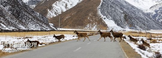 西藏工布江達(dá)縣境內(nèi) 白唇鹿群過公路(圖)