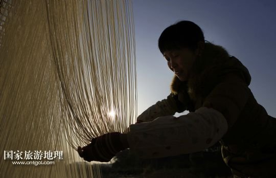 據(jù)了解,秦家圈村有冬季制作手工拉面迎新年的傳統(tǒng)。村民經和面、發(fā)酵、盤條、拉面、晾曬等多道工序,手工制作成細潤綿長、風味獨特的面條。制面期間,潔白的線面宛若銀絲在風中飄蕩,成為鄱陽湖畔一道別致的鄉(xiāng)村景觀。 /新華社發(fā)(傅建斌 攝)
