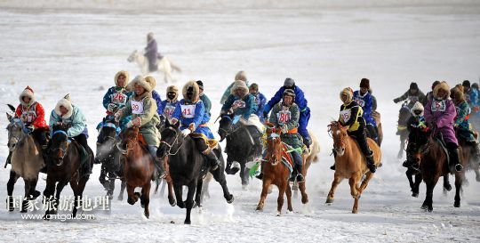 國家旅游地理 內(nèi)蒙古錫林郭勒1月5日訊 1月4日,牧民們在賽馬比賽中。當(dāng)日,2014年“銀色西烏珠穆沁”杰仁馬文化節(jié)在內(nèi)蒙古錫林郭勒盟西烏珠穆沁旗舉行。當(dāng)?shù)孛晒抛迥撩裆碇A麗的服飾,帶著自家的馬匹,冒著風(fēng)雪嚴寒,從四面八方趕到會場,參加了賽馬、套馬、乘馬拾物、蒙古馬選美等多項比賽,吸引了來自全國各地的游客、攝影愛好者以及附近的大批牧民。 /新華社記者任軍川攝