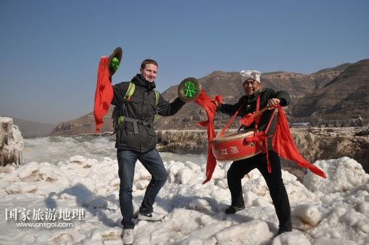 國家旅游地理 陜西延安1月26日訊 1月25日,一名游客在黃河壺口瀑布景區(qū)與民俗演員合影留念。當(dāng)日,受凌汛影響一度關(guān)閉的黃河壺口瀑布景區(qū)重新開放迎賓,游客可近距離欣賞“冰瀑玉壺”的壯麗景觀。 /新華社發(fā)(呂桂明 攝)