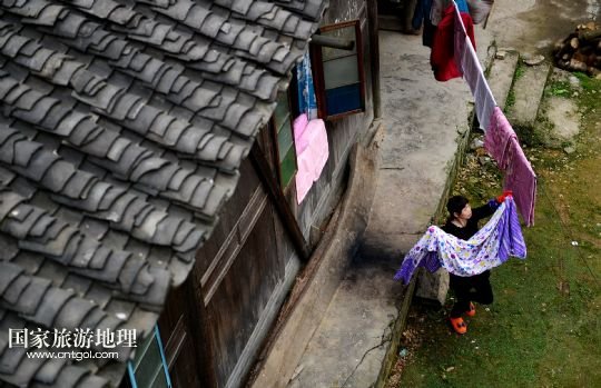 3月27日,一名土家女子在慶陽古街的吊腳樓前晾曬衣被。