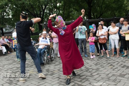 7月18日,穆斯林群眾在北京牛街的路邊跳舞。新華社記者 吳凱翔 攝