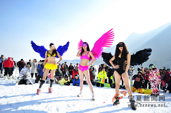 2016年1月1日,新年第一天,在銀川蘇峪口國家森林公園滑雪場,幾位身著色彩艷麗比基尼美女在雪中秀身材并展示瑜伽技巧,吸引了眾多滑雪愛好者的目光。當(dāng)日,蘇峪口滑雪場前來滑雪的人達(dá)數(shù)千人。 寧夏新聞網(wǎng)記者 祁瀛濤 攝