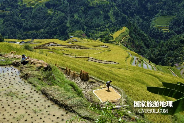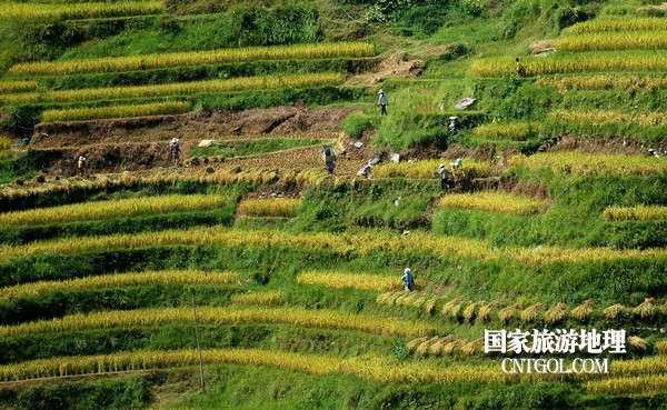 國家旅游地理貴州黔東南9月6日訊(龍夢前 攝影報道)9月5日,貴州省黔東南苗族侗族自治州從江縣加榜鄉(xiāng)黨扭村、加頁村和加車村萬畝水稻開鐮收割。
